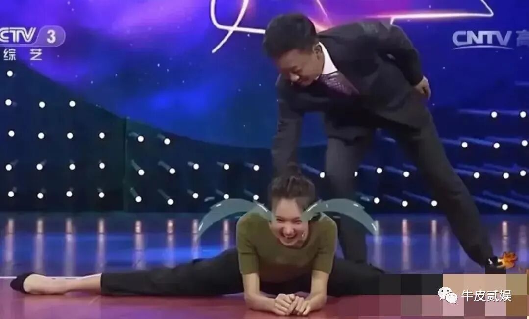 她在参加朱军的节目时,要表演劈叉,尴尬的是劈到后面劈不动了,所以朱老哥就过去帮忙了。