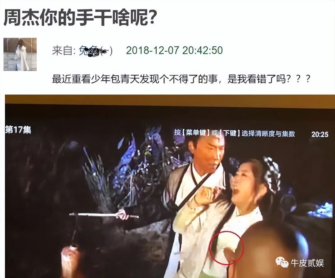 周杰曾经在拍摄《少年包青天》时,曾用他的大手这样搂过刘怡君,一把放在胸部,始终拿不下来。