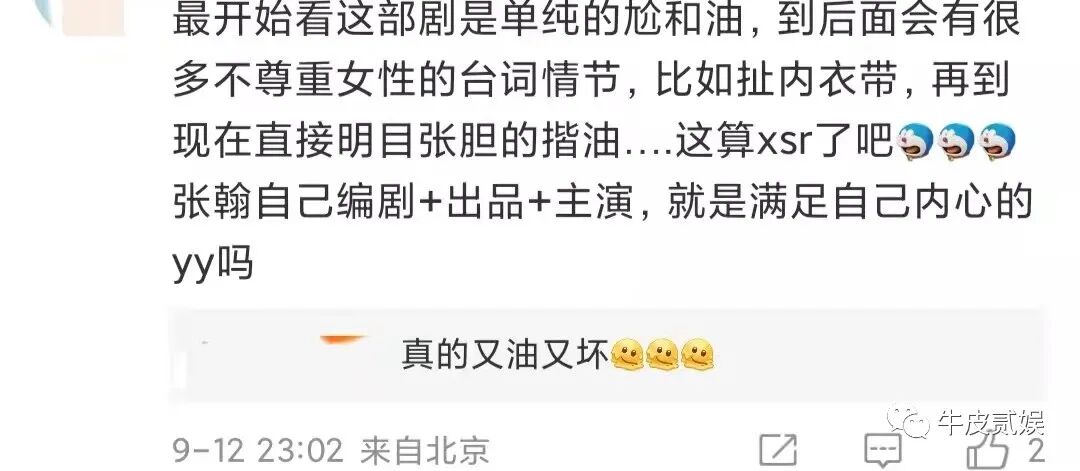 他号称这部剧历时四年打造,但播出以后,剧情拉垮就不说了,他还上演了五花八门的“咸猪手”,连人民网都给它定义为了“油腻”、“悬浮”、“尴尬”。