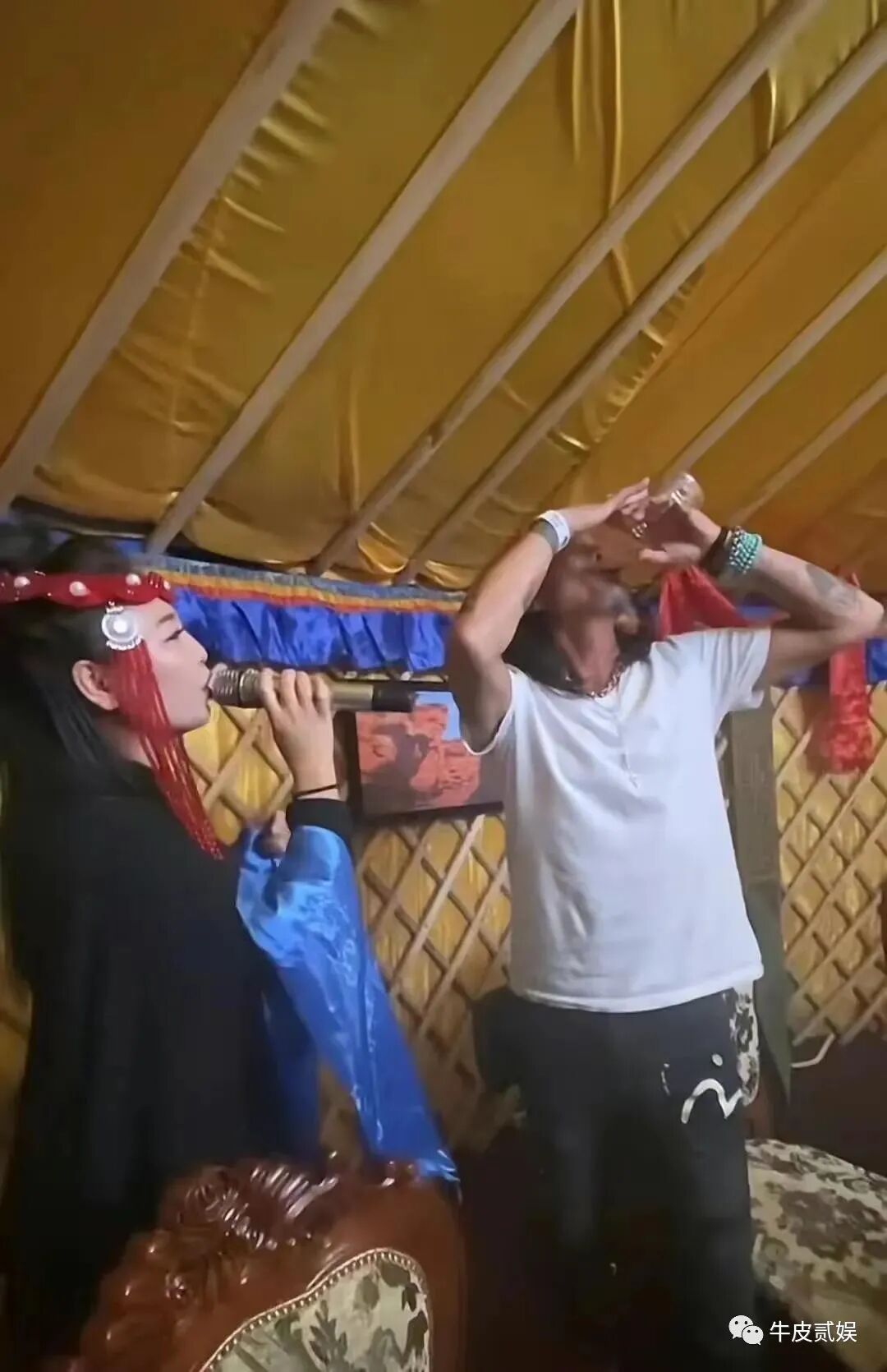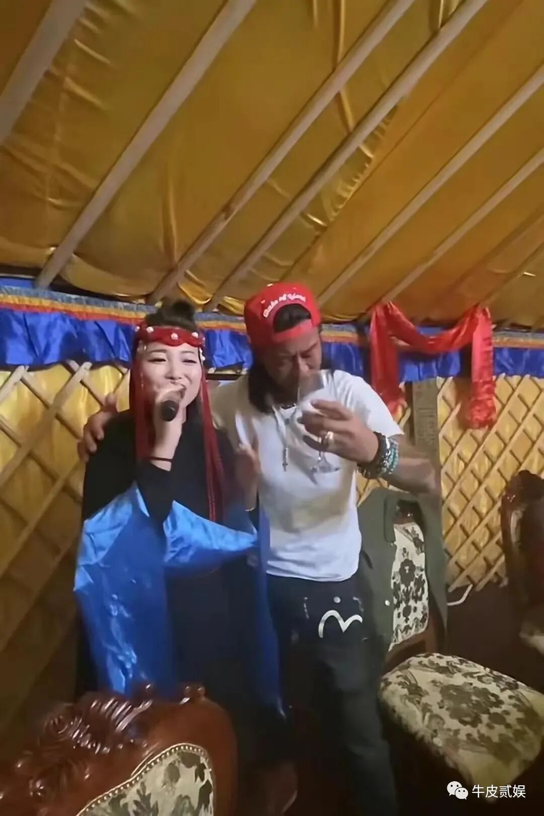 还搂着身边的美女,一同高歌。