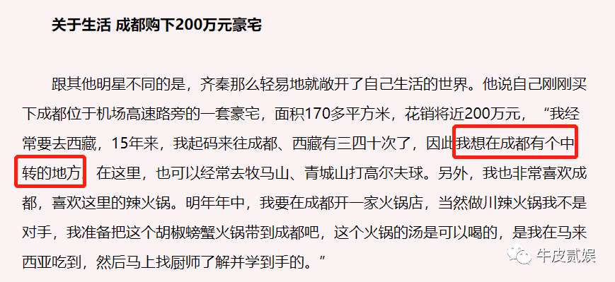 除了这些房子,齐秦还在成都的其他地方买下了房子,并且他在做“好声音”导师期间还爆料,自己在别的城市同样拥有房产投资。