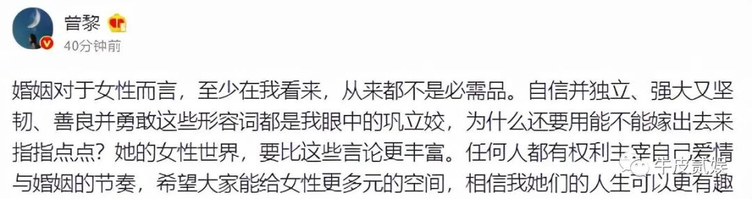曾黎也曾在公共平台发布了自己的观点:婚姻对于女性而言,至少在我看来,从来都不是必需品。