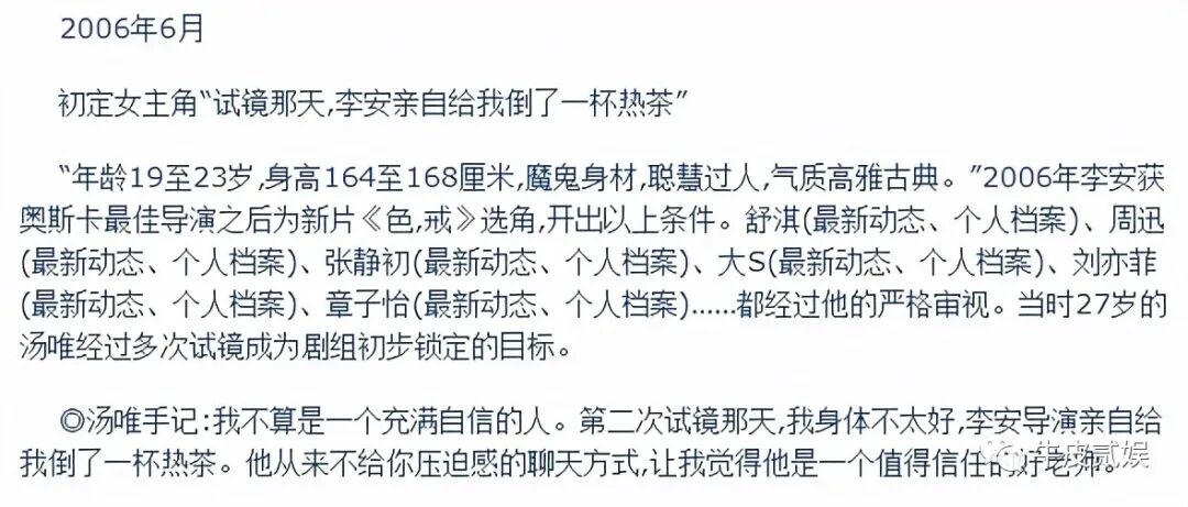 巧合的是,汤唯在剧组里恰好遇到了熟人,在熟人的介绍下,汤唯见到了李安,而李安仅仅看了她两眼便在心中有了答案。