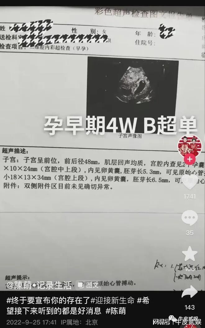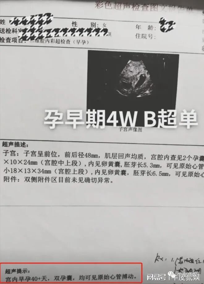 直接就在社交平台晒出了一张产检单。单子上的内容具体啥意思,咱也不知道,但是有懂的网友立刻就发现了亮点,“双孕囊”就是指怀的双胞胎的意思。
