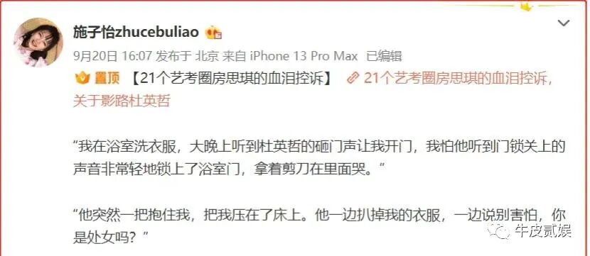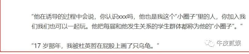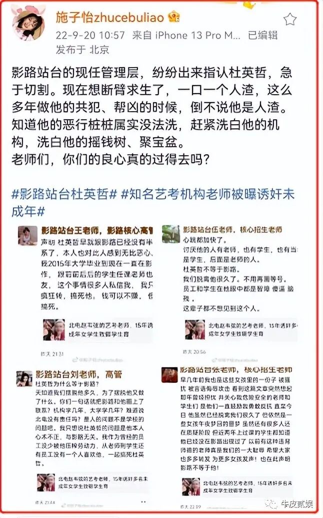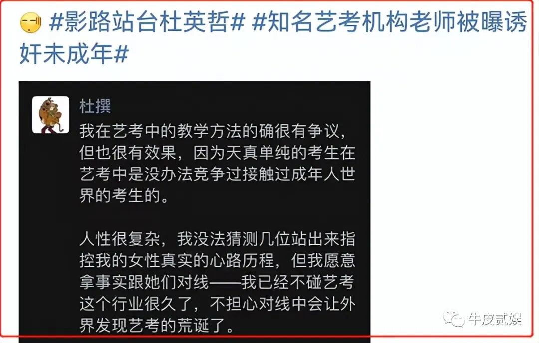 在她的小作文中,她称自己是北电的学生,这次也被赵韦弦骚扰了,但艺考圈内有所有人心知肚明的一个秘密,赵韦弦的艺考老师,影路校长杜英哲,有更严重一万倍的恶行。