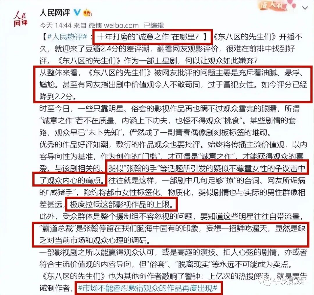 咱们先看看《人民网》的发声,不到两百字的小作文中,结果用到了“将都市女性标签化,物质化”、“张翰的手”、““俗套”、“咸猪手”等众多犀利措辞。