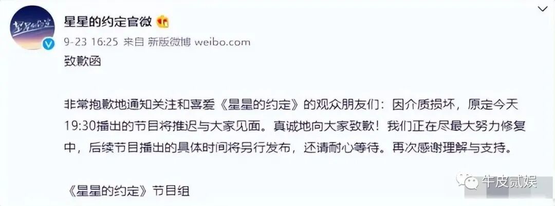 但他参与录制的综艺《星星的约定》却突然宣布延播,给出的理由是 " 介质损坏 ",什么时候恢复播出也没有准确的消息。