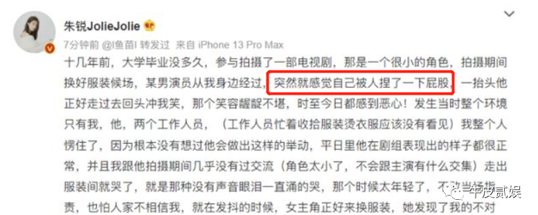 前段时间,圈内女星朱锐在自己的博文中发表了一篇长文,控诉了自己刚出道时被性骚扰的事。