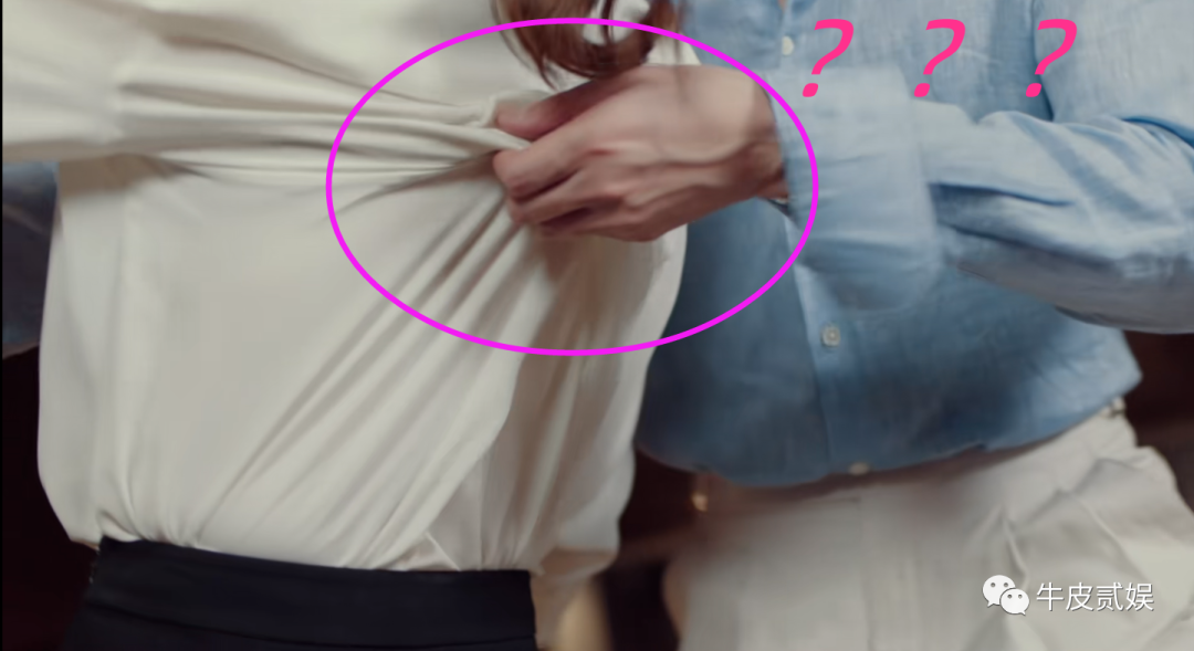 本来这一幕是个很好的暧昧片段,但却因为张翰的“咸猪手”而彻底地毁掉了,只见他手一歪,故意拽住女主的内衣带往下用力。