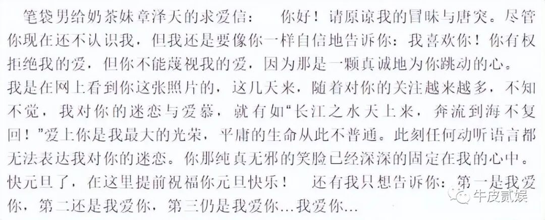 那个时候,网络开始普及,贴吧里有个叫“笔袋男”的男子,为了追到她,给她写了一篇小作文。