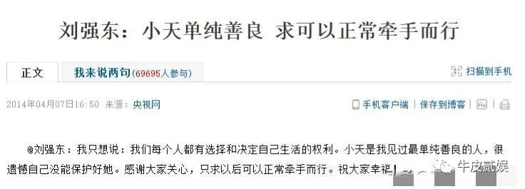 而老刘看到后,赶紧发文为自己心爱的女人辩护,称小天单纯善良,只求大家不要言语攻击,让他们可以正常牵手。
