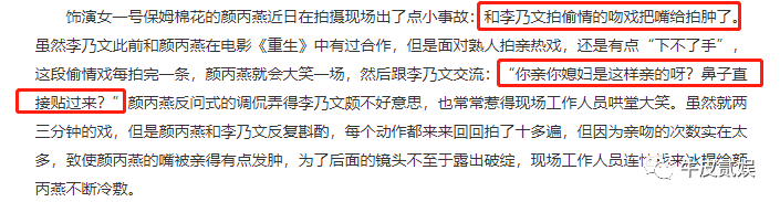 但是后来颜丙燕实在忍不住,看着监视器也觉得那个镜头并不好看,于是就直接对李乃文说:“谁接吻不张嘴呀!”,把李乃文搞得十分羞涩,而他与颜丙燕的这段吻戏,也成了李乃文的荧幕初吻。