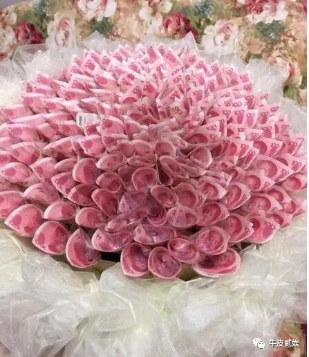 上百万的票票叠成一大束玫瑰花,中间还放张空白支票让她随便填。