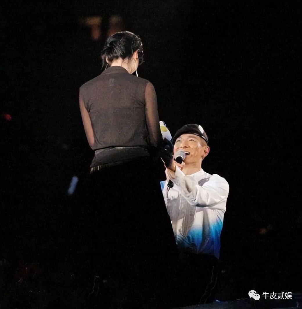 演唱会舞台上唱得正嗨时,刘德华单膝下跪对助唱嘉宾吴倩莲表白。