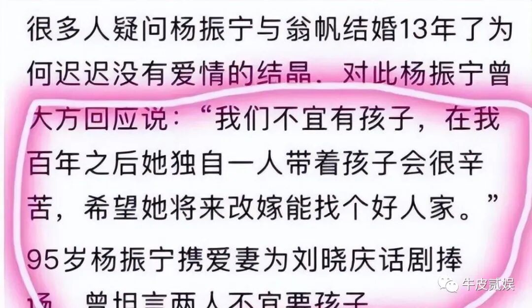 但杨老先生却不这么认为,他并不觉得翁帆嫁给自己要用“牺牲”来定义,相反他倒是觉得彼此之间是真爱。
