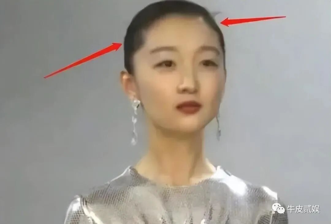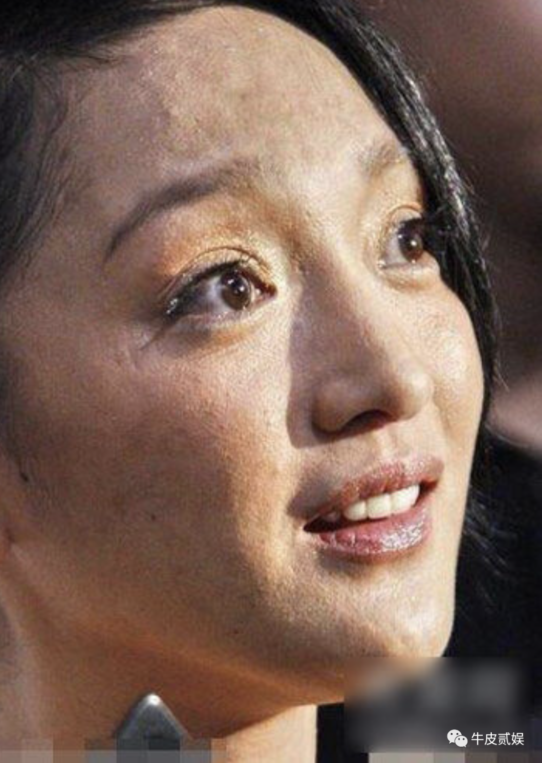 现实照片里的她,脸型偏方,鼻梁没有了荧屏上的“挺括感”,法令纹明显,黑眼圈严重,整张脸给人一种枯黄下垂的感觉。
