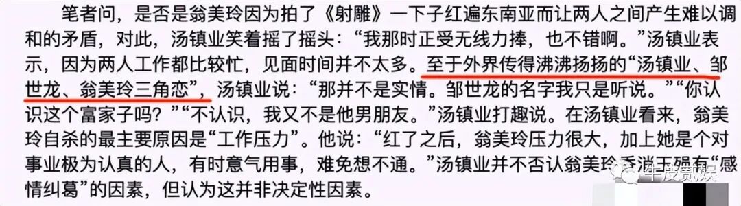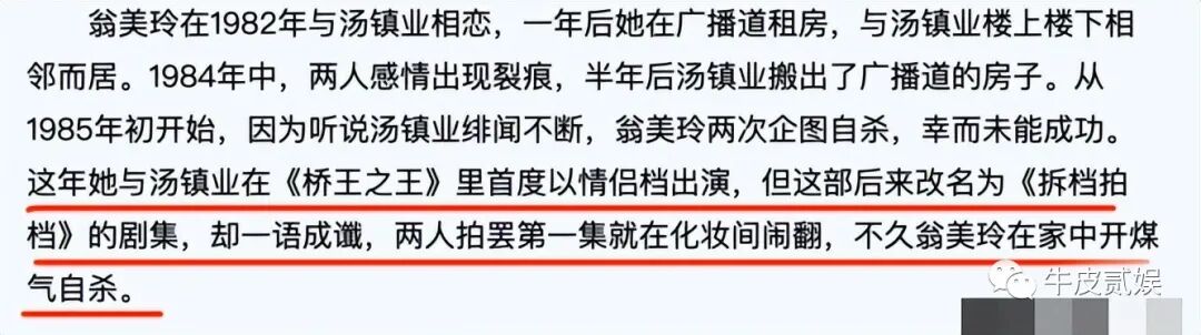 但是后来汤镇业经常和一些女性朋友吃饭,并且被媒体拍到,这让翁美玲无法接受,曾经自杀过一次,没有成功。