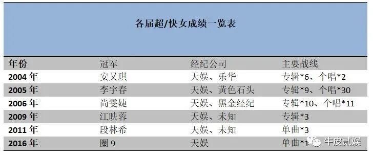 但这么多年过去了,提起“超女”冠军,能想起来的也只有李宇春,而她之前的冠军、之后的冠军站在李宇春的高度上之后,就忙不迭的下去了,有的已无人问津,有的已沦为普通人。