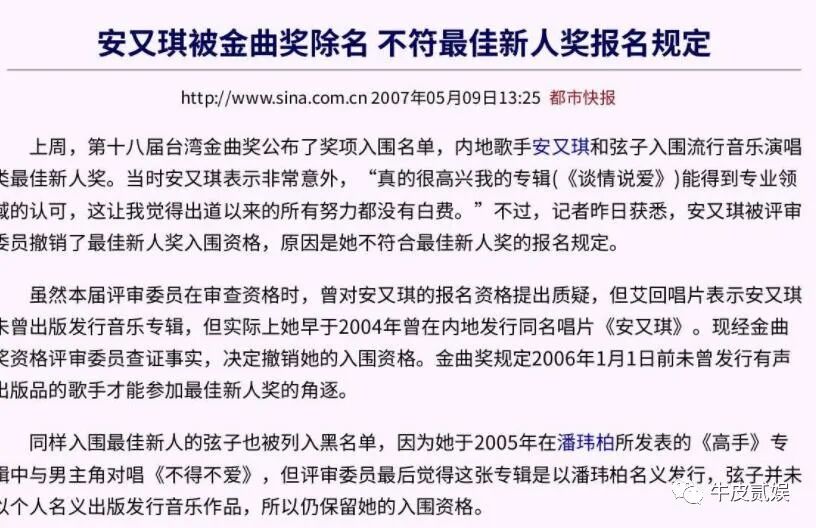 原来,只有2006年之前没有出过唱片的歌手,才能获得此奖,而安又琪早在2004年出道已经发过专辑。