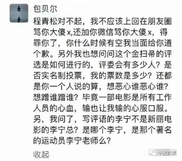但与王宝强相反,他不是真诚地出来道歉,而是直接在朋友圈开骂,觉得自己“获奖”,与程青松的个人恩怨有关,且质疑评选过程不透明,言辞之中,很不服气。