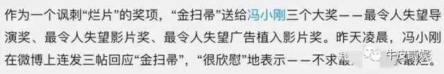 而冯小刚和他的徒弟王宝强除外,冯裤子因《非诚勿扰2》一下子拿到了三个“金扫帚大奖”,随后他连发三贴回应了这事: