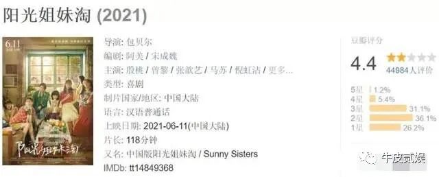 前段时间,包贝尔导演的电影《阳光姐妹淘》,豆瓣评分最终定格在了4.4分,烂片的帽子是摘不掉了。