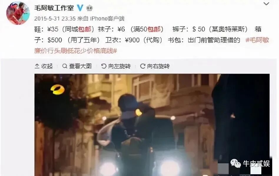 穿的鞋是几十块一双的国产货,袜子是6块的,裤子50,箱子500,还用了五年了,卫衣900,书包是给助理借的。