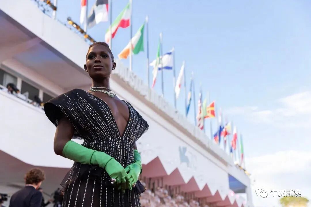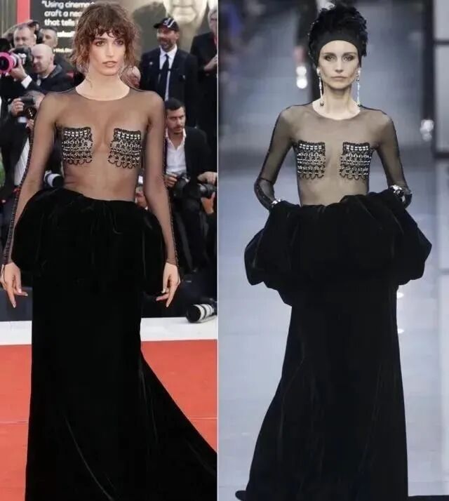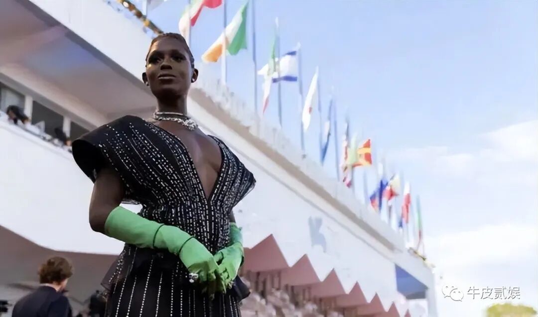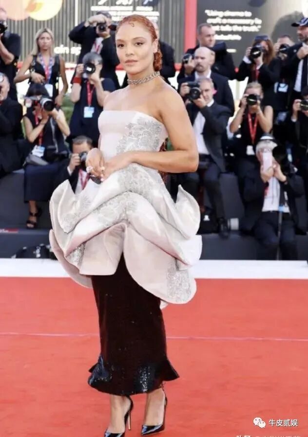 威尼斯红毯上的格蕾塔身穿纯黑色的深V宽松长裙,虽然是高定礼服,但整体平平无奇,既没有凸显身材,也没有其他新奇的设计。