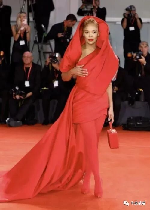 泰莎选择了一身大红色的连衣裙,这是Elie Saab的高定裙装,裙子本身没什么问题,但穿在泰莎身上,却是满满的乡村土味风。
