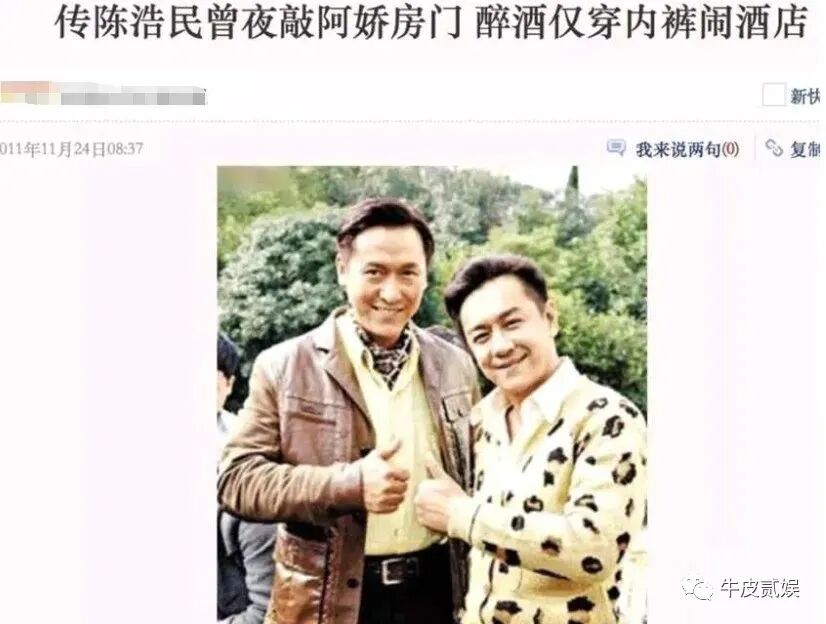 除了“狼吻事件”,陈浩民还被媒体曝出骚扰阿娇的新闻,深夜敲响阿娇房门,只穿内裤醉酒在酒店闹事。