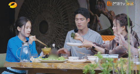 等到吃饭环节,容祖儿更是表现出了一个亲密伴侣的姿态,当着王子文的面给吴永恩热情地夹菜。