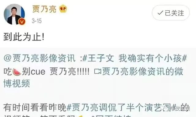 当然了,也有网友爆料说这孩子的爹可能是贾乃亮的,对此,老贾也做出了声明:“到此为止!”