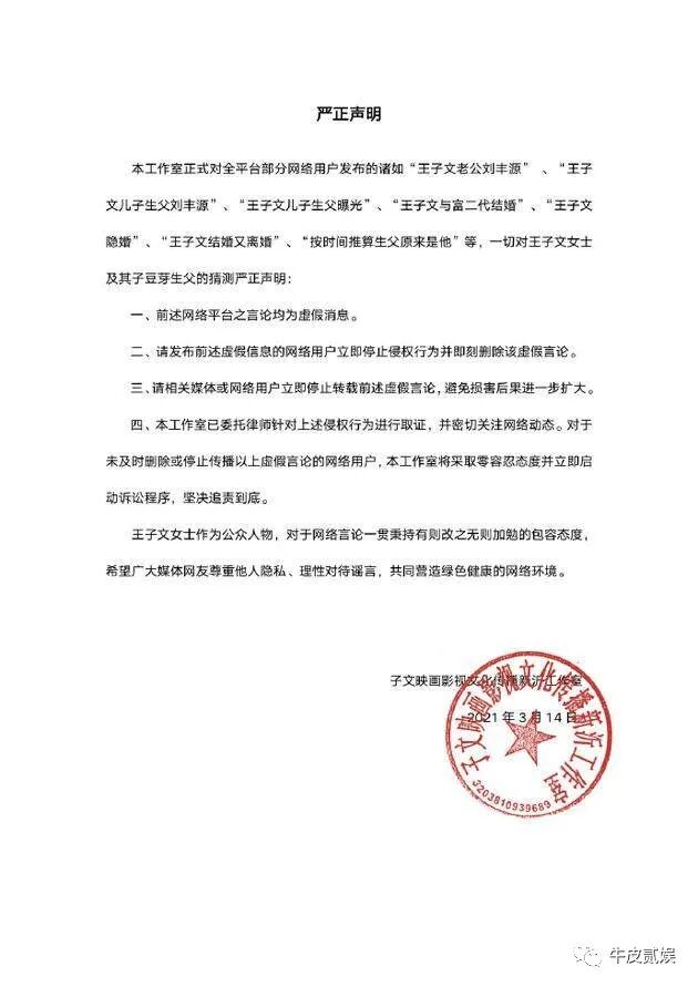 面对这样的报道,王子文一直不作回应,但直到传出这男孩的爹是刘丰源时,王子文才发了一纸律师函。