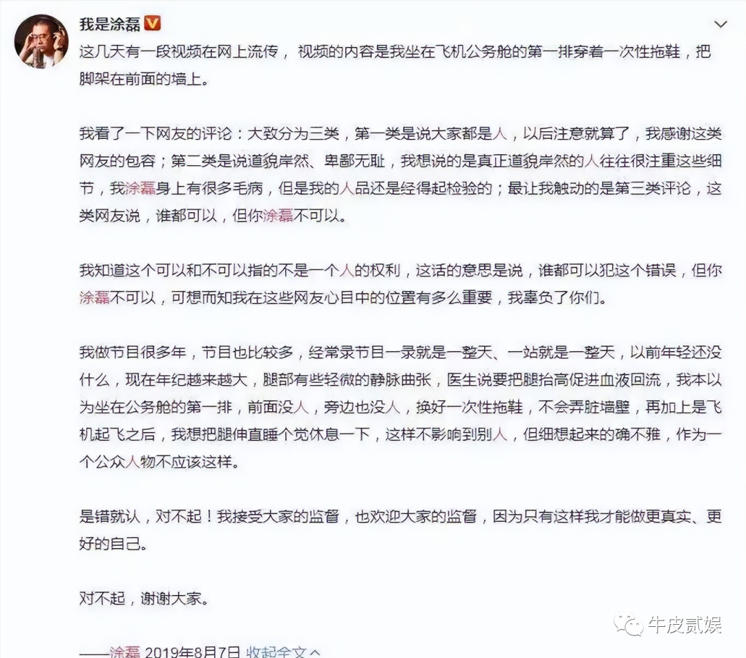 面对铺天盖地的指责,涂磊即刻发文道歉,称自己患有静脉曲张,前面有座位上没有人,才将脚伸出去的。