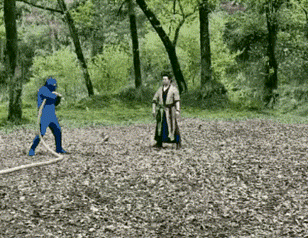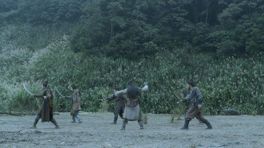 里面使用了大量的慢镜头以及站着不动的打戏,并且为了展现南宫的快速,将几个镜头虚化拼接到了一起。可以看到在全景之下必然也是使用绿幕。
