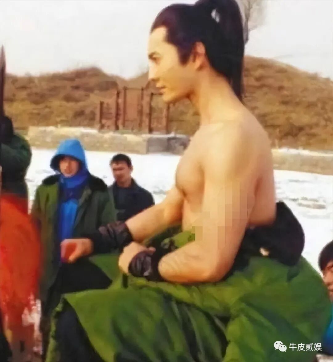 黄晓明在冬天拍夏天的戏时,上身露出完美的身材,下身则裹着军大衣保暖。