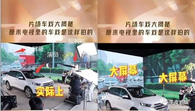 但当镜头拉远,才发现车子原地不动,全靠周围的LED显示屏,为了看起来更真实,人工造树、人工造风一样不落。