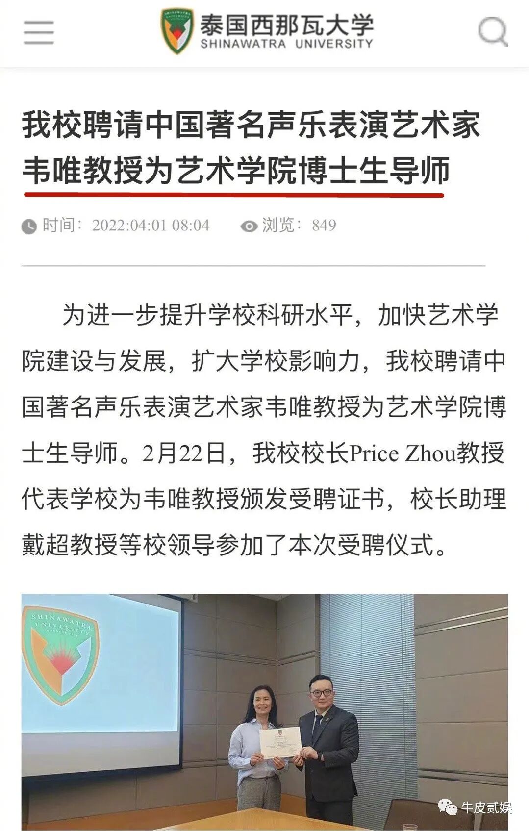 2022年4月1日,韦唯以绝对的实力被泰国西那瓦大学聘为艺术学院博士生导师,开始了自己的教师生涯。