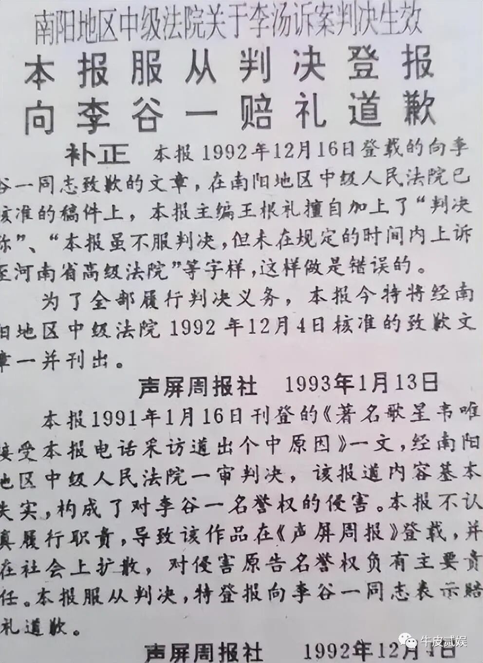 而就在这时,一家叫做《声屏周报》的报社借着韦唯之口发表一篇文章,该文直接将李谷一推到了舆论的风口浪尖,最终引发了一场明星“名誉侵权案。”