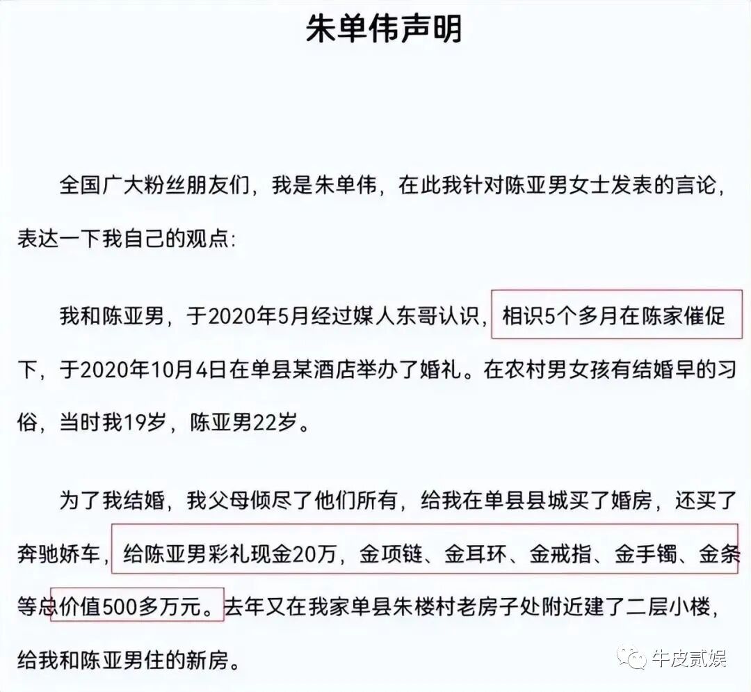 但这番毫无证据的空头小作文显然没有说服力,反而是朱家的详细声明让陈亚男哑口无言。