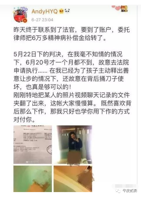 甚至因为对法院执行补偿金的判决不满, 他在微博曝光数张黄奕的大尺度隐私照。