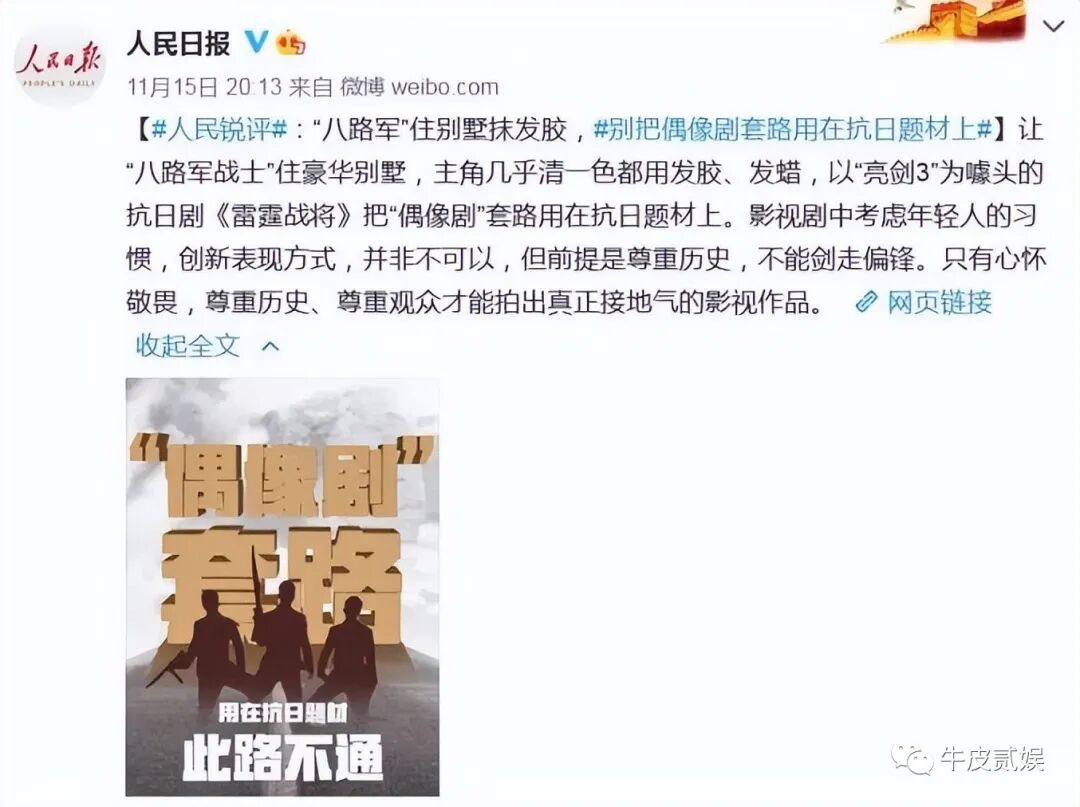 最终该剧播出后,引来了众人的不满,人民日报直接狠批这部剧是把“偶像剧”的套路用在了抗日题材上了。