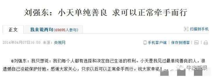 随着两人亲密照在网上疯传,老刘害怕给奶茶妹妹带来伤害,于是就赶紧发文称:“小天是我见到过的最善良,最单纯的女孩。”