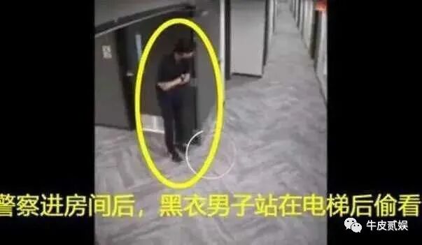 第三个,警察进去后,电梯口有黑衣男子偷看。这个黑衣男子躲在这里偷看又偷笑,意欲何为?明显就是自己设的局,只是撕破脸了,最终也都不再顾忌脸面了。
