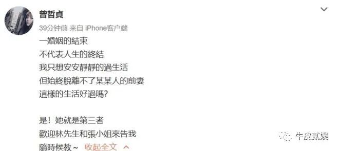 终于在2020年5月,曾哲贞通过个人社交平台对当年的事情第一次做出了回应,直言张庭是第三者,欢迎对方来告,态度非常强硬。