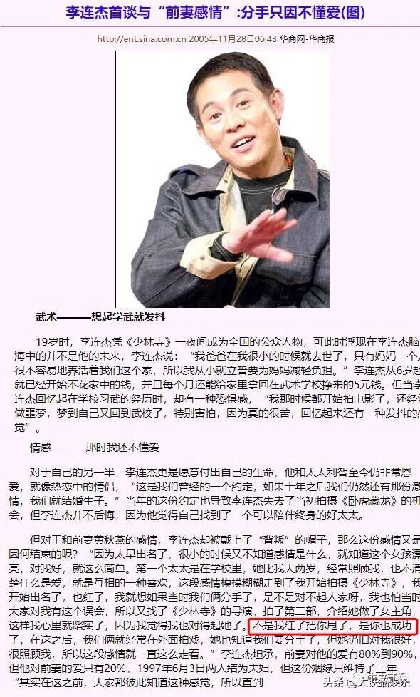 1980年,因伤退役的李连杰因出演《少林寺》一炮而红,随着鲜花掌声的蜂捅而至,他对这段感情开始动摇了。