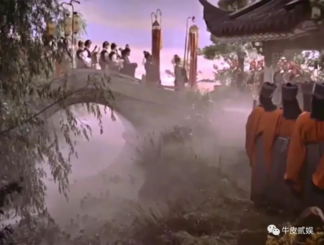 由于年代太早,那时候的拍摄条件有限,所以这版昭君出塞的画面很简陋,背景选在了一处拱桥边,角落站着稀稀落落的朝廷百官和宫女,场面过于寒酸。