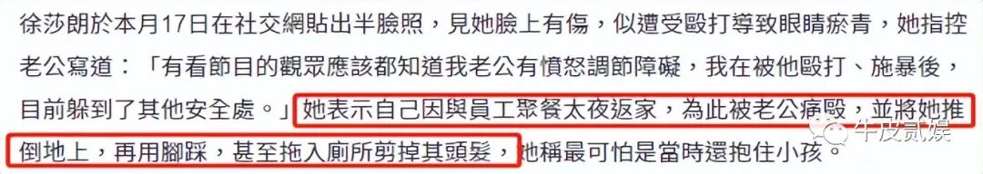 徐莎朗声称因为自己与同事聚餐回家太晚,所以才遭到了家暴,当时老公将她推倒在地狠狠殴打,还用脚踩她,甚至去厨房拿菜刀威胁她。