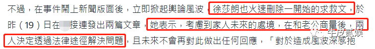 她声称考虑到家人的情况,她与老公决定私下通过法律途径解决此事,之后也不会再回应这件事。