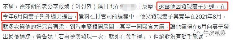 据李政焕称,徐莎朗从2021年8月开始就多次出轨,而她的外遇对象正是老公的好兄弟,两人经常去酒店开房,还曾一起吸食毒品。